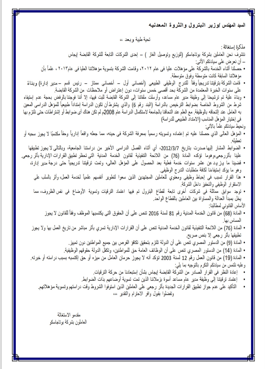 العاملون بشركة بوتاجاسكو يرفعون مذكرة لوزير البترول للمطالبة بإعادة النظر في وقف ترقياتهم بعد اعتماد مؤهلاتهم العليا
