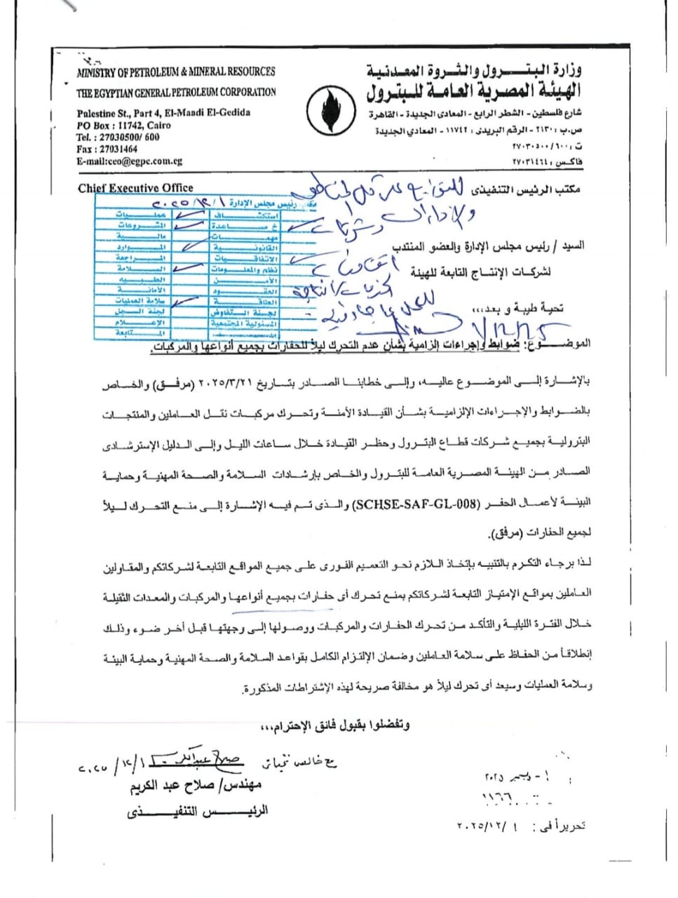 وجاءت التعليمات في خطاب رسمي وُجّه لرؤساء مجالس إدارات شركات الإنتاج، تضمن التأكيد على منع دخول أو خروج أي سيارات أو معدّات فنية أو معدات حماية من المواقع إلا بتصاريح رسمية واضحة وصادرة من قطاع السلامة بالهيئة، مع التشديد على الالتزام التام بتعليمات دليل الاعتماد للخطر (SCSHE-SAF-GL-008) لضمان السيطرة الكاملة على الحركة داخل المواقع.