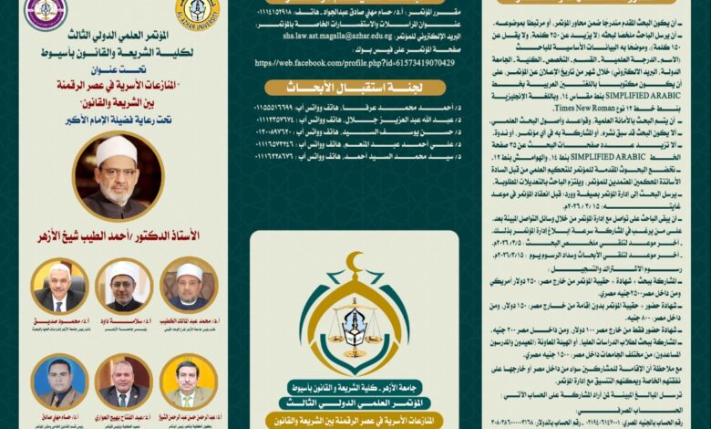 تحت رعاية كريمة من فضيلة الأستاذ الدكتور/ أحمد الطيب – شيخ الأزهر الشريف، تنظّم كلية الشريعة والقانون بأسيوط – جامعة الأزهر المؤتمر العلمي الدولي الثالث، تحت عنوان: