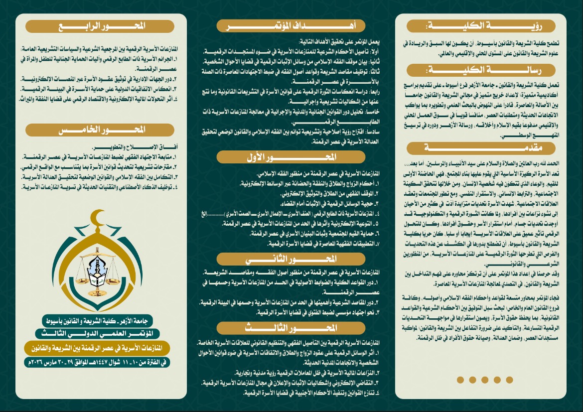 «النزاعات الأسرية في عصر الرقمنة بين الشريعة والقانون»، وذلك خلال الفترة من 10 إلى 11 شوال 1447هـ الموافق 29 – 30 مارس 2026م.