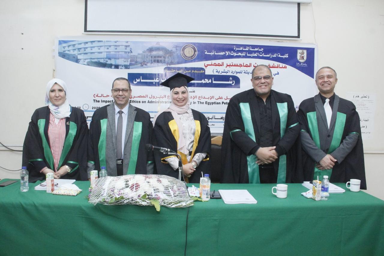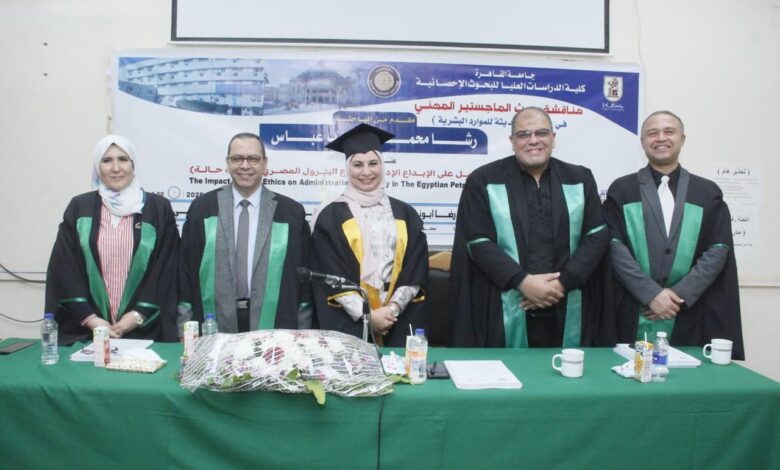 وقد أقرت لجنة التحكيم والمناقشة بكلية الدراسات العليا للبحوث الإحصائية بجامعة القاهرة رسالة ماجستير بعنوان (أثر أخلاقيات العمل على الإبداع الإداري بقطاع البترول المصري)، للباحثة رشا محمد حرب، المدير العام المساعد لتخطيط القوى العاملة، بالادارة العامة لتنمية الموارد البشرية، بالشئون الادارية بشركة بدر الدين للبترول.